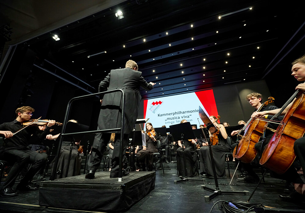 In der beseelt-lebendigen Kammerphilharmonie „musica viva“ spielen die fortgeschrittenen Streicher des Landesmusikgymnasiums. Zum Repertoire gehören dabei barocke Streicherkompositionen genauso wie romantische Literatur des 19. Jahrhunderts oder zeitgenössische Werke des 20./21. Jahrhunderts – auch Uraufführungen standen bereits auf dem Programm. Das Ensemble wird regelmäßig zu größerer Besetzung aufgestockt und arbeitet immer wieder auch symphonisch.